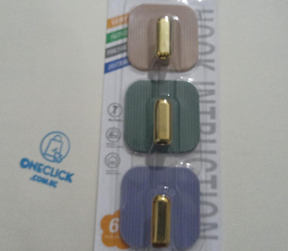 El paquete contiene tres ganchos de diferentes colores: beige, verde azulado y morado.